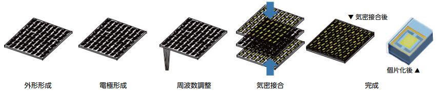 通過(guò)使用晶片級(jí)封裝,其中具有諸如通過(guò)光刻工藝形成的振動(dòng)部分的外形的三個(gè)石英晶片被接合和單個(gè)化,可以在不使用導(dǎo)電粘合劑的情況下減小保持部分和振動(dòng)部分的厚度。它實(shí)現(xiàn)了整體結(jié)構(gòu)。這解決了伴隨傳統(tǒng)結(jié)構(gòu)中產(chǎn)品的小型化并確保諸如石英晶振元件的安裝位置的余量的提高導(dǎo)電粘合劑的涂覆精度的問(wèn)題。另外,通過(guò)在真空中進(jìn)行晶片清潔和粘合,可以降低質(zhì)量風(fēng)險(xiǎn)。