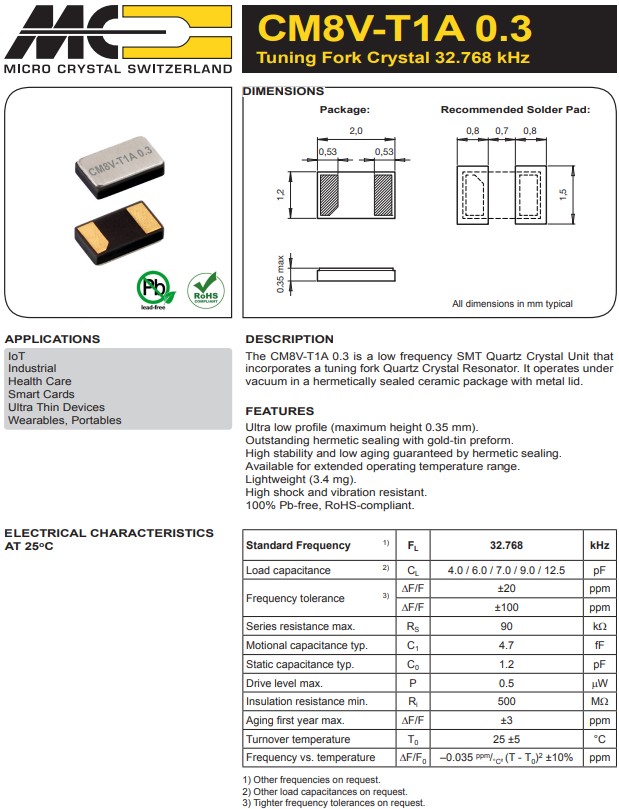 | CM7V-T1A-32.768kHz-12.5pF-100PPM-TA-QC | Micro Crystal | 晶體 32.768 kHz 12.5 pF +/-100 PPM -40/+85C |