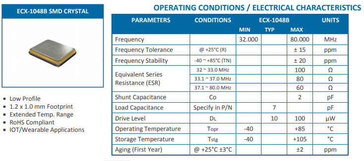 越小型的ECX-1048B晶振是ECS Inc最小巧的緊湊型石英晶振.尺寸僅為1.2*1.0*0.33mm,陶瓷封裝頻率可從32.000MHZ到80.000MHZ,在25度下頻率偏差可達(dá)+-15PPM,在高溫-40~+85度的情況下頻率穩(wěn)定度仍可達(dá)+-20ppm.負(fù)載電容常用的是7PF,聯(lián)系我們可以根據(jù)所需要求訂制相同參數(shù)產(chǎn)品.
