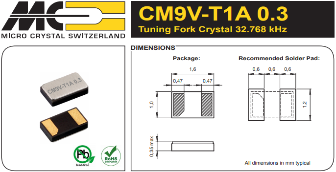瑞士微晶晶振在今年5月1日專為智能卡,電子紡織品,可穿戴設(shè)備,活動帶,嵌入式模塊產(chǎn)品,醫(yī)療保健,電子藥物治療貼膏藥等產(chǎn)品研發(fā)并發(fā)布了是款超薄型智能穿戴石英晶振.CM9V-T1A晶振,體積僅為1.6*1.0mm,厚度0.3mm,最大厚度僅為0.35mm. 相比同款尺寸日本大真空的型號DST1610A晶振,尺寸為1.6*1.0mm,厚度0.45mm.日本愛普生FC1610AN晶振,尺寸為1.65*1.05mm,厚度0.5mm.日本京瓷晶振公司則還沒未研發(fā)出同款小尺寸封裝晶振.精工晶振型號SC-16S晶振尺寸及厚度則跟愛普生差不多.其實還有很多產(chǎn)品技術(shù)會跟不上,很多更小尺寸的晶振產(chǎn)品都還在研發(fā)過程中.比如專攻32.768KHZ的精工晶振,現(xiàn)正開發(fā)SC-12S晶振,尺寸為1.25*1.05*0.5mm,要是被開發(fā)出來,將會讓更多大體積的貼片晶振”無家可歸”.瑞士微晶CM9V-T1A 0.3晶振,頻率32.768KHZ,尺寸1.6*1.0*0.3mm,現(xiàn)官方已經(jīng)大批量生產(chǎn)增加中.并與CM8V-T1A 0.3晶振,尺寸為2.0*1.2*0.3mm共批量生產(chǎn)中.