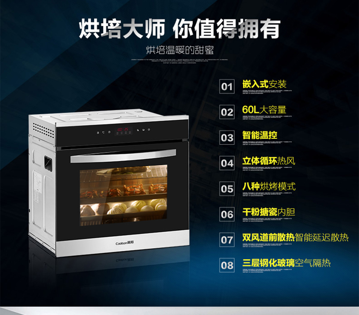 60L大容量;內置全自動精確控溫探頭;立體循環熱風;高溫搪瓷內膽;