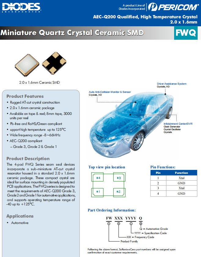 Diodes百利通晶振,FWQ車載晶振,FW400WFMR1超小型SMD晶振,FW2500016Z無源晶振,2016mm晶振