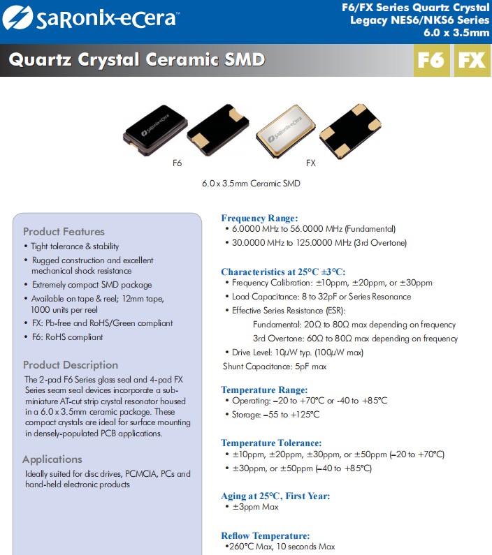 Diodes百利通亞陶晶振,FX四腳貼片晶振,FX0800015晶體諧振器,兩腳貼片F6系列玻璃密封和4腳貼片FX系列接縫密封裝置包含一個亞微型AT切割條形石英晶體諧振器,封裝在6.0x3.5mm毫米的陶瓷封裝中。這些緊湊型晶體適用于表面安裝在高密度的平板印刷電路板應用中。緊密的公差和穩定性 堅固的結構和出色的抗機械沖擊能力 極其緊湊的SMD封裝 提供磁帶和卷軸;12毫米膠帶,每卷1000個。FX:無鉛且符合RoHS/Green標準,F6:符合RoHS標準。