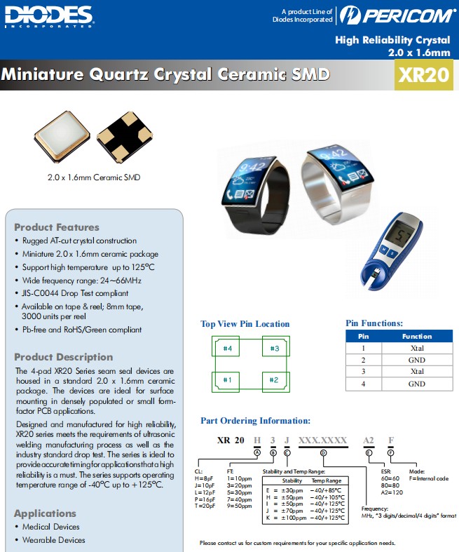 Diodes百利通晶振,XR20無源晶振,XR20H3J26.0000A2F晶振,醫療設備晶振